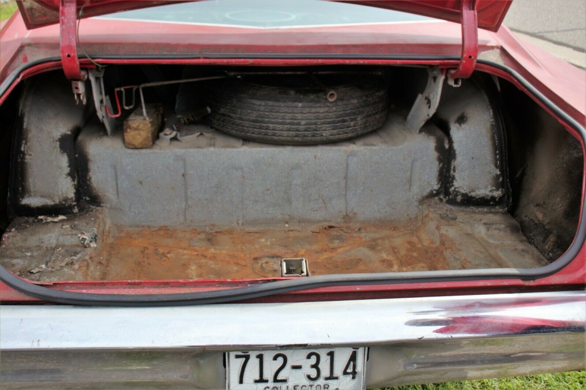 It’s not a perfect automobile by any means, with some rust in the trunk and little dings here and there on the body. The rear quarters had rust at some point and contain filler now from those repairs. From the photos, it looks as though some redo work will be needed, but we’re told the frame and floorboards are solid. The red paint is past its prime and the car would look great with a respray. For 90,000 miles, the interior looks good with no obvious issues with the upholstery, carpeting, or headliner.
