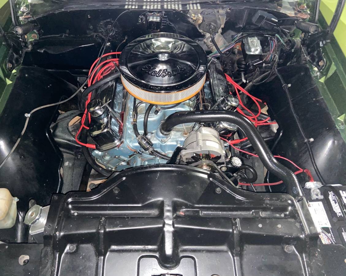 The car looks more like a quick flip than a low mileage survivor. There is overspray on some parts of the door latch and other areas, the area of the passenger lower rear molding is really wavy. It has mid-70’s 6x heads, Edelbrock intake, dual feed Holley, swap meet chrome valve covers, cheap steering wheel, aluminum radiator, new Hurst shifter and inexpensive generic tach and under dash gauges. Those are not typically parts you find on a low mileage car that’s being sold at a premium. That’s the sort of car a seller of will spend a little extra money on to find more correct parts since those parts will pay for themselves when it comes time to sell. For nearly $40,000 there are much better cars out there.