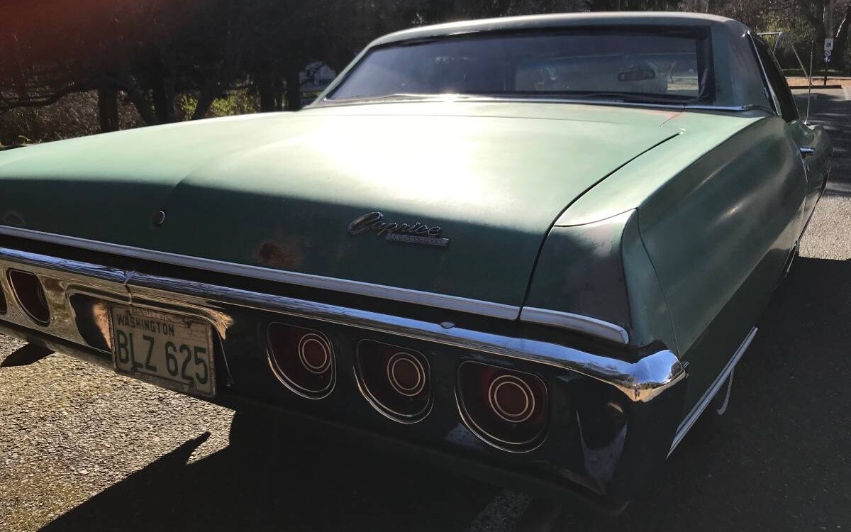 It looks like some Caprice standard features have been pilfered. The running lamps in the front fender edges are gone, replaced by Impala(& lower levels) ribbed filler chrome. The clock is not there, either. Did this have the desired factory Tach & gauges at one time?Evidence of a multiplex or 8-track on front of console, too. No kick panels to confirm speakers. I would like to see pictures of the rest of the interior, including glass. Only Full size ’68 Chevy without vent windows – there are vents in the dash ends (like an A/C car).