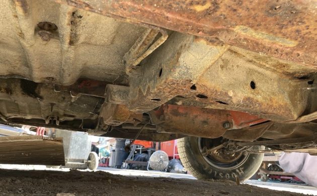 A few shots from below are also provided, which seem to back up the owner’s claim that most of the main parts are good, including the front and rear rails. The torsion support and firewall are also listed as solid, so hopefully, the steel that will require most of the attention will be the exterior panels.