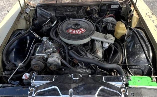 This could be a nice project for someone whom has a bit of moola to invest. The vinyl top appeas nice and save for worn paint.a nice respray could be done without a fortune. A bit of research could get door straps easy. Now as per the 455. If it’s an oem it makes it even more interesting. If it aint it’s still a 455. Has an H.E.I. was it added on or again an engine transplant and the A.I.R. system was probably ripped of because the 455’s had these.from the get go.