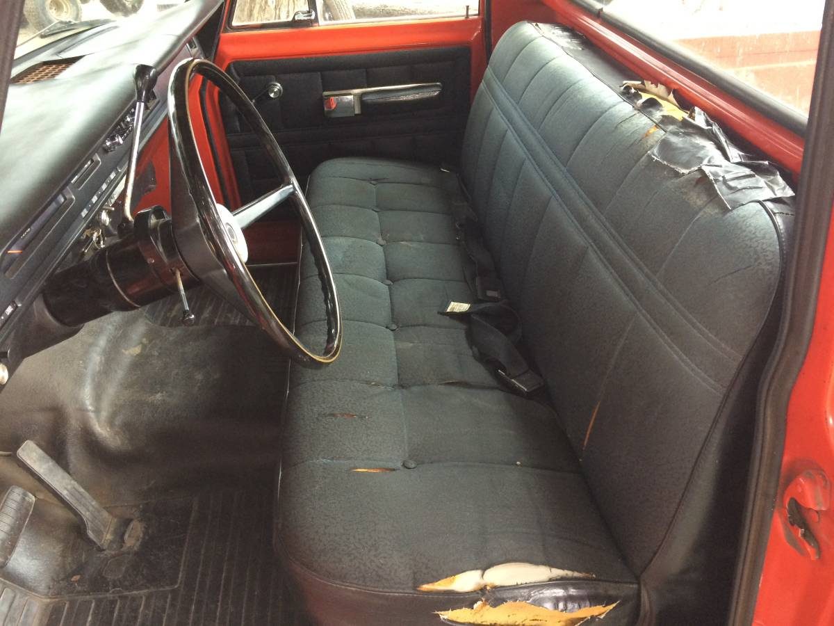 The inside looks very original. The seat is not the plain vinyl seat you’d expect to see but appears to be cloth. It is a very well optioned truck so perhaps that upholstery could be original. Someone has done a good job of matching the duck tape to the upholstery.