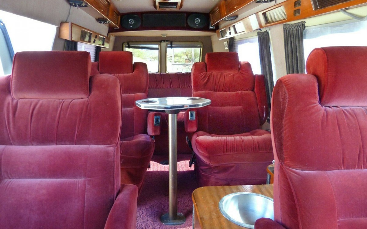 There are no photos showing the bare steering wheel or dash but one could assume that they may be showing a bit of sun damage like a lot of people in the southwest are. The interior is fantastic, not really a camping van but more of a weekender. There is a sink behind the driver’s seat and enough seating for a few people.