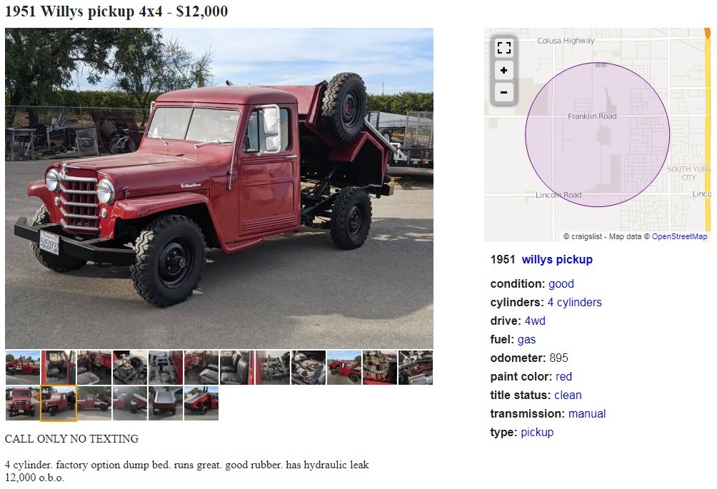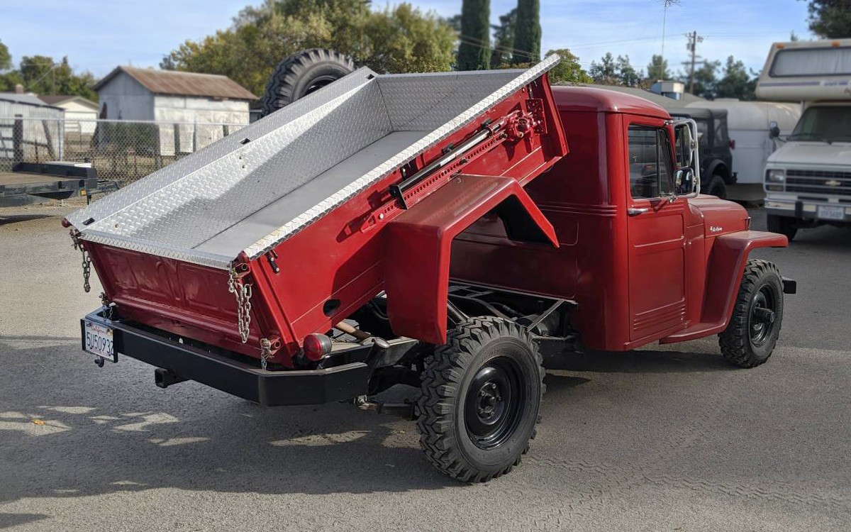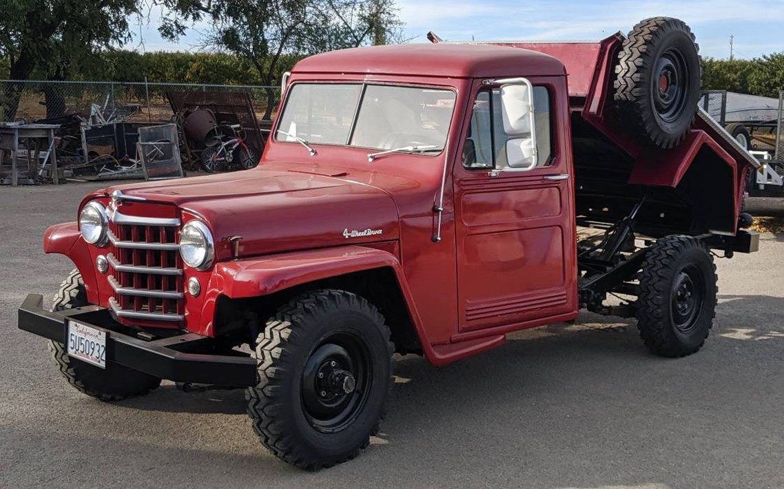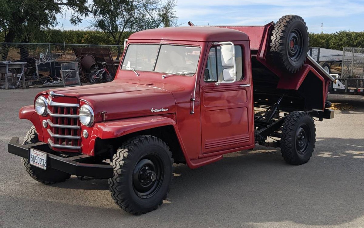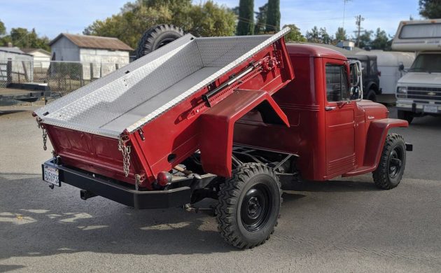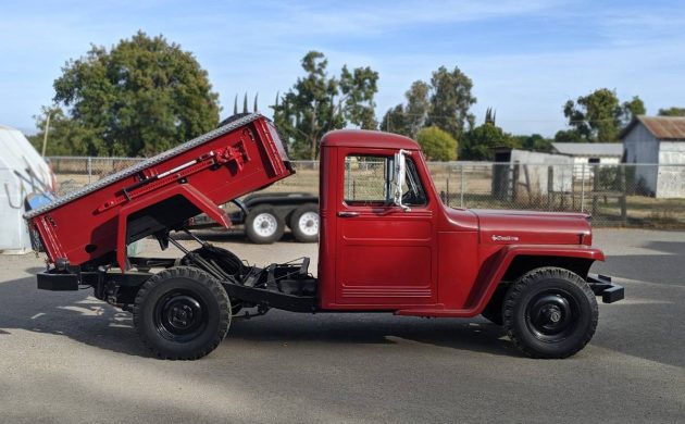 Have any of you seen a dump bed on a Willys pickup? The seller refers to it as a factory option, but I can’t find anything about it other than a mention of the ’57 pickups having one as an option. It’s posted here on craigslist in Yuba City, California, and they’re asking $12,000. Here is the original listing, and thanks to T.J. for the tip!
