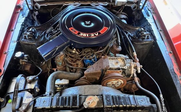 Giddyup is provided by a 250 gross HP, 351 CI V8 engine saddled up to a three-speed automatic transmission. The seller states, “Under the hood, the original Numbers Matching 351 runs well. The transmission goes into gear and shifts properly.”
