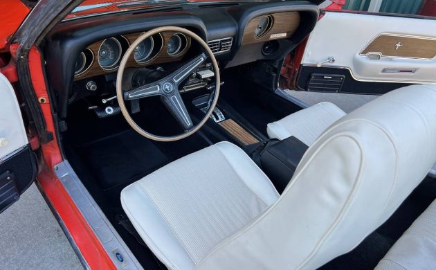One of the attractive aspects of this Mustang is the fact that it’s just an ordinary Mustang convertible, not a Grande, Mach I, Bossasaurus of some kind – no pretension, just an enjoyable drop-top ride. Parsing the numbers, the convertible body style was responsible for 7,600 copies in ’70, or just 4% of the 190K total that left one of several Ford assembly lines (this example originated at San Jose, CA). This 85 K-mile example is sporting ocean deep Calypso Coral paint, topped with a white folding top. The seller refers to it all as “factory,” which I guess is a nod to originality unless he means any rejuvenation has been performed to reflect born-with characteristics, such as the exterior respray. The body of this convertible is arrow straight, and the underside image reveals a clean and rust-free structure. The seller does mention, however, some corrosion that has manifested itself along the lower passenger side door and quarter panel, essentially reducing this car to a “twenty-footer.” Added is, “Get closer and the deficiencies become apparent. There are touch-ups & bubbles. From what we can see, it has seen a single repaint.” The Magnum-style wheels appear to be a deviation from stock as they’re not referenced on the accompanying Marti report, but they do this Mustang justice.