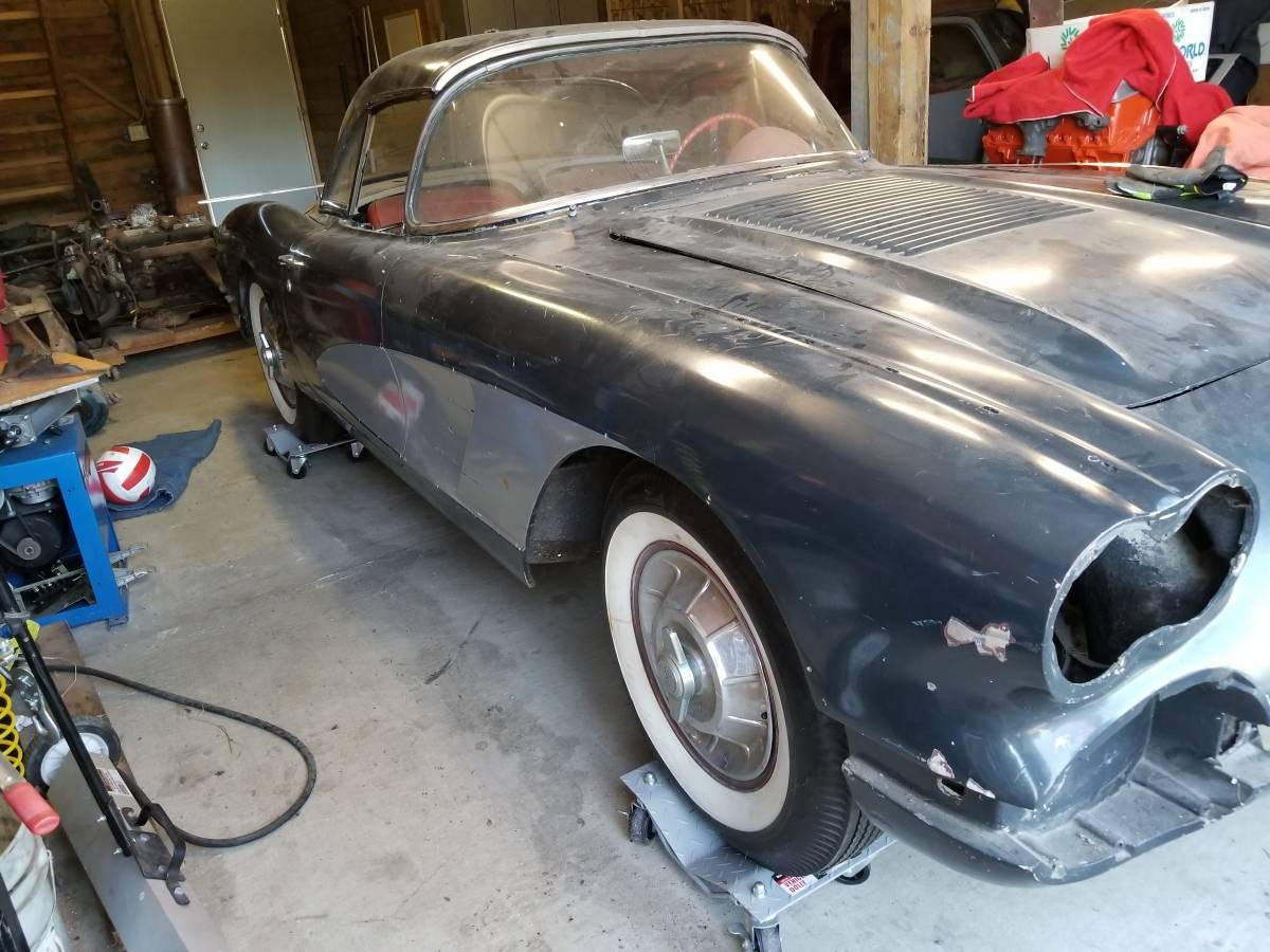 The seller reports that the car is 95% complete. Hopefully, most of the missing parts are available in reproduction. The body appears to be in good condition. There are no pictures of the undercarriage and the seller makes no claims about the condition of the frame. Interested parties will want to look under the car to check the condition for themselves. According to the owner, only 729 of the 1958 Corvettes produced were painted in this charcoal with silver coves color combination. Charcoal painted cars could have been ordered with either charcoal, beige, or red interiors. This one came with a red interior.