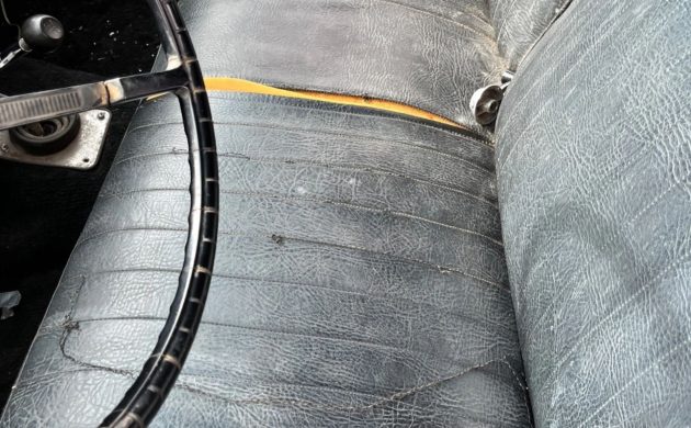 Some restoration tasks remain. A new convertible top is included but not yet installed, along with a new dash pad, glovebox liner, and additional spare parts. Interior items such as door panels and the front seat will require attention, though the original rear seat is said to be usable. The tires hold air but are described as old and in need of replacement.