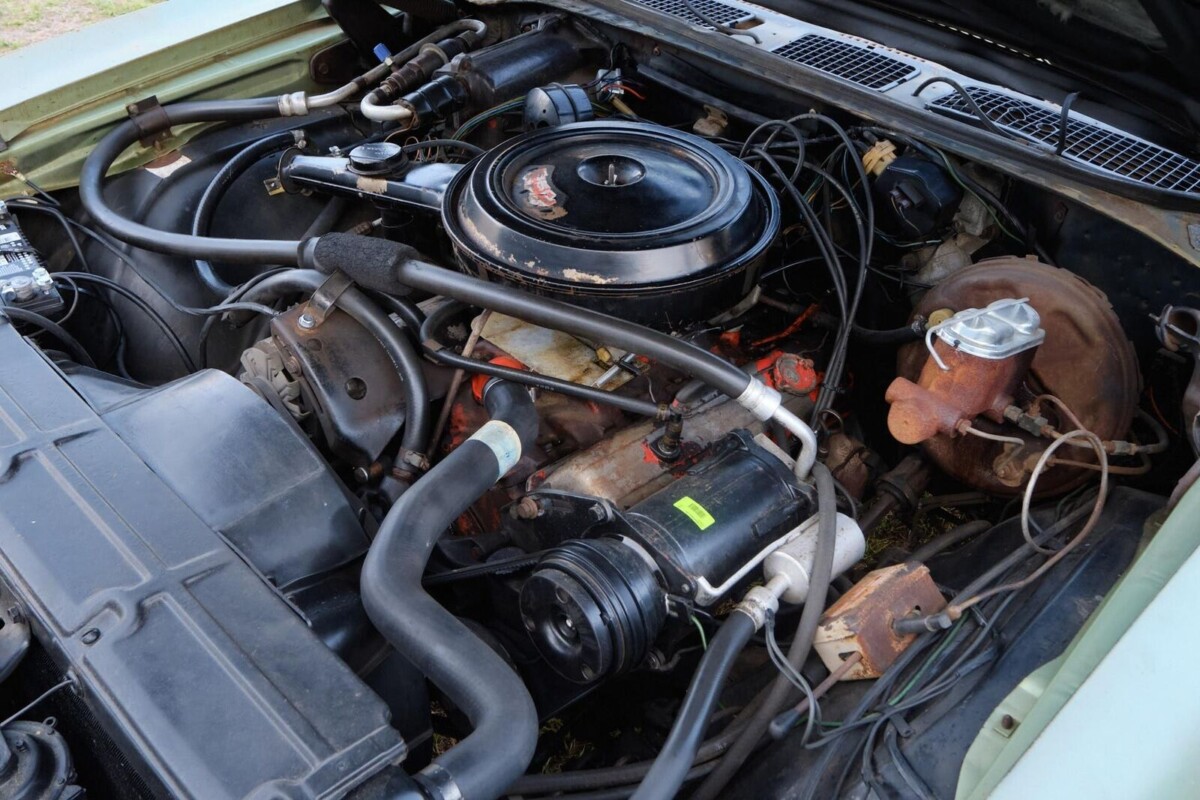 Although it’s being advertised as an “original survivor,” I’m thinking the vinyl saddle-colored seat upholstery and dark brown carpeting aren’t original. I mean, considering its age and that it’s a station wagon, the front and rear bench seats look like they haven’t been sat on. And maybe it’s the lighting in the photos, but the seat upholstery also appears to be a slightly different shade of color than the door panels. The dash, instrument panel, and steering wheel look very good, but there are no photos of the headliner.