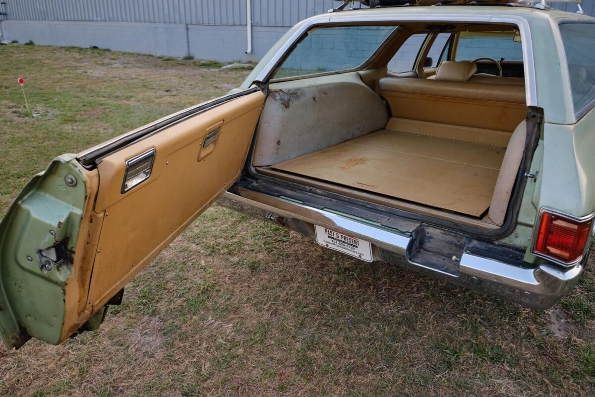 This Chevelle wagon, offered through a Florida Dealer, has the word “original” thrown around quite a bit in the ad, but doesn’t give us any history or background. Chevelles could be ordered in 15 Magic-Mirror acrylic lacquer paint options in 1970, 12 of which were new colors. Light green metallic and lime gold metallic were popular paint options back in the 1970’s and looking at the supplied photos, the Code 45 Green Mist Metallic is original as it is faded overall and thin in some areas. You can also see a number of dents and other parking lot battle scars which aren’t unusual for a 53-year-old non-pampered, kid-hauling grocery-getter. It has the optional roof luggage carrier as is was called in the Chevelle sales brochure, but I’m guessing the current Rally Wheels weren’t on it when it left the factory. There’s a few small rust spots visible, a piece of trim is missing from the dented tailgate, but the chrome bumpers look good as does the glass. All Chevy wagons had the dual-action tailgate that can “swing down for cargo and swing wide for people,” plus the built-in rear bumper step. Chevelle wagons were available as two-seat or three-seat models, and this one is a two-seater.