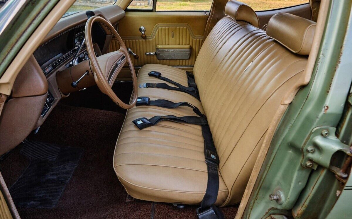 Chevelles in 1970 came standard with a choice of a Turbo-Thrift 250-cubic inch 6-cylinder or a Turbo-Fire 307 cubic-inch V8. Bigger powerplants were available as options, and this Chevelle has one with its original Turbo-Fire 350-cubic inch V8 nestled in a rather clean engine bay. The mileage is listed at 69,008 but there’s no mention if that’s the original mileage or if it has the numeral one in front of it. The 350 is paired to its original automatic transmission. The seller doesn’t tell us how the Chevelle runs or drives or what work has been performed on it recently or through the years. Chevelle offered four station wagon trim levels in 1970: the entry-level Nomad, the Chevelle-level Greenbrier, the Malibu-level Concours, and the upscale Concours Estate. Although this wagon is being advertised as the top-of-the-line Concours Estate, I believe it’s actually the Concours trim level. Photos I found online show “Concours Estate” badging on the rear fenders of that trim level and this Chevelle is showing “Concours” badging. So, what do you think of this faded green grocery getter?