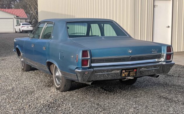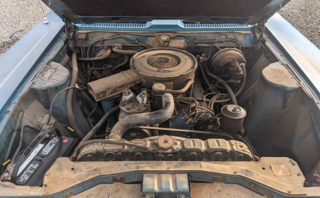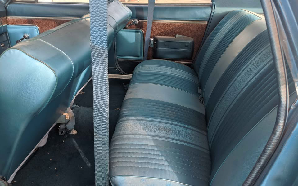 The seller says this car retains its original paint – 44A, Caravelle Blue Iridescent, according to the data plate they show in the photo gallery – but clearly the right front fender has something going on. The trim and badges are missing from the RF fender, and it’s as faded as the memory of the good ol’ days. The left rear quarter panel is also faded, as you can see above. I’m not sure what’s going on there, but otherwise, this looks like a straight car. Speaking of straight, I’m rarely a fan of exhaust tips poking out of the back like that, but at least they don’t appear to have long chrome extensions. Dual exhaust was optional for the 343 V8, and “big, shiny wheel discs” (i.e., wheelcovers) were standard on the SST line.
