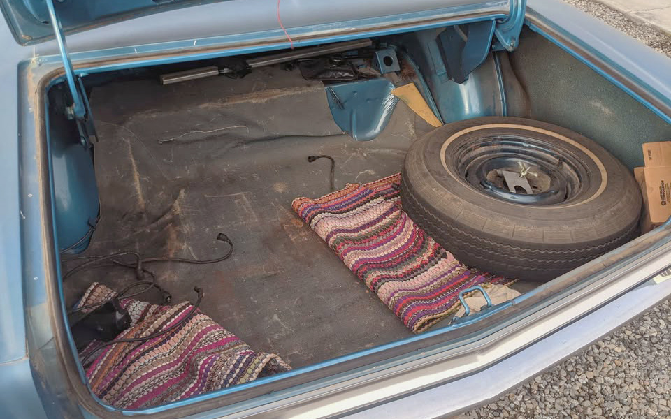 The original seat fabric is great, other than the obvious split on the driver’s seat bottom portion. Is that a 60/40 seat? Individual reclining seats were standard on the SST line, but a center armrest and headrests were optional. This one doesn’t have headrests or a center armrest that I can see. The back seat looks perfect. Air-conditioning was standard on this car, but power windows were optional. The little square portion of color-matched vinyl on the doors is interesting. I’m not sure how that made it past the otherwise usually spot-on AMC interior designers. The trunk is huge, and it looks clean overall. This car was $3,151 new.