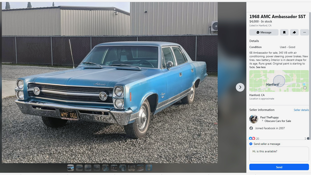 Couple things as mentioned, this has A/C and I believe was standard on the Ambassador, not many offered, electric wipers, also, the dual exhaust was an option with the 343 or 390, and probably part of the “SST” package. Contrary to belief, “SST” did not mean “Super Sonic Transport”, but “Super Sport Touring” and this car became known as the “Kenosha Kadillac”[sic]. You couldn’t have gone wrong here, but too late. Cars like this don’t stick around long, unlike the $5 figure ones. This is what people today want, and a big thanks to the seller for not gouging someone needlessly. California isn’t all bad,,