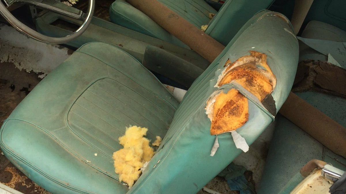 In addition to the driveshaft on the inside, as opposed to where it’s supposed to be, the interior is largely intact but in pretty bad shape.