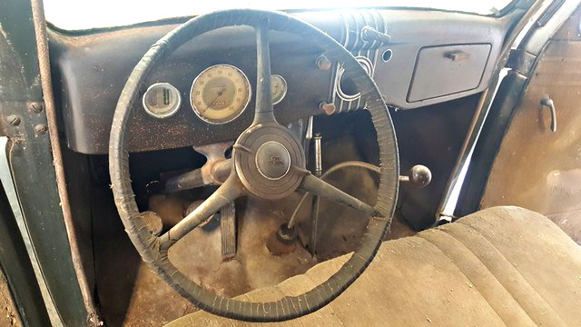 Inside is a very original interior that really makes you wonder what happened to this old Ford for it to have wound up parked? The steering wheel is cracked, where someone cleverly wrapped the wheel in tape. The factory seat upholstery and door panels are in place, but are heavily dirty, and likely cannot be saved. All of the interior trim, and pieces appear in place, and the dash although lightly covered with surface rust, has a nice appearance with no major damage.
