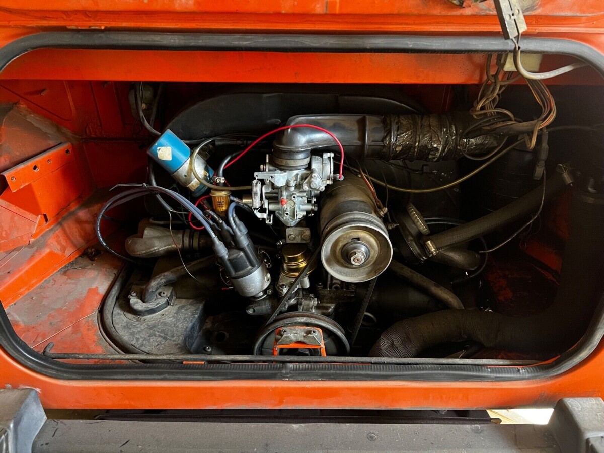 Looking at the photographs, this Thing looks pretty original and appears to have been enjoyed and used but not abused. It’s got its share of little dents, bumps, scratches, and imperfections, but we’ve seen rougher and rustier VW Things here on Barn Finds through the years. The Pumpkin Orange paint looks original and isn’t perfect by any means, but isn’t bad, either. There are some thin and uneven spots along with some rust where the fender and body meets and under the driver’s door. The bumpers have a few bumps on them too but nothing serious and there’s even a trailer hitch on the rear – something I have never seen on a Volkswagen Thing. You can’t help but notice the orange roll bar. That’s because this Thing doesn’t come with the convertible top and frame. The seller shares that a 4-wheel disc brake system along with new 15″ wheels and tires were installed last year and that the original hub caps and the soft top door uppers are included.