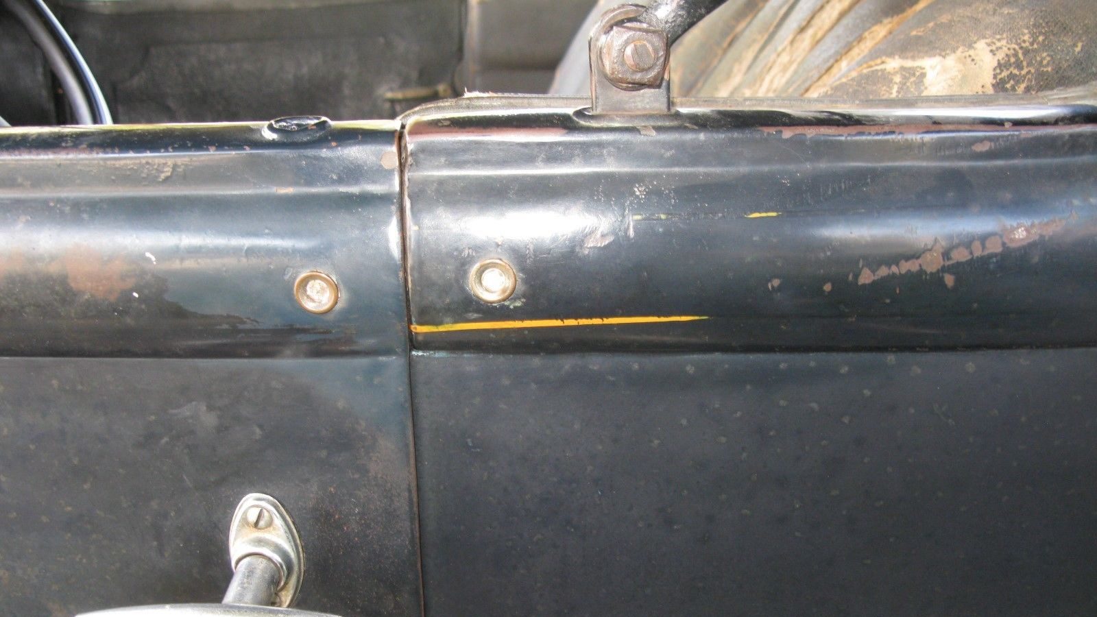 You can see here where the black repaint has rubbed off showing what could be the original blue paint. It’s confusing, as the seller says this Model A was originally blue and it has the original blue paint. Does he mean it’s original paint under the black paint? But then he also said the body panels were “replaced and all Henry steel”.