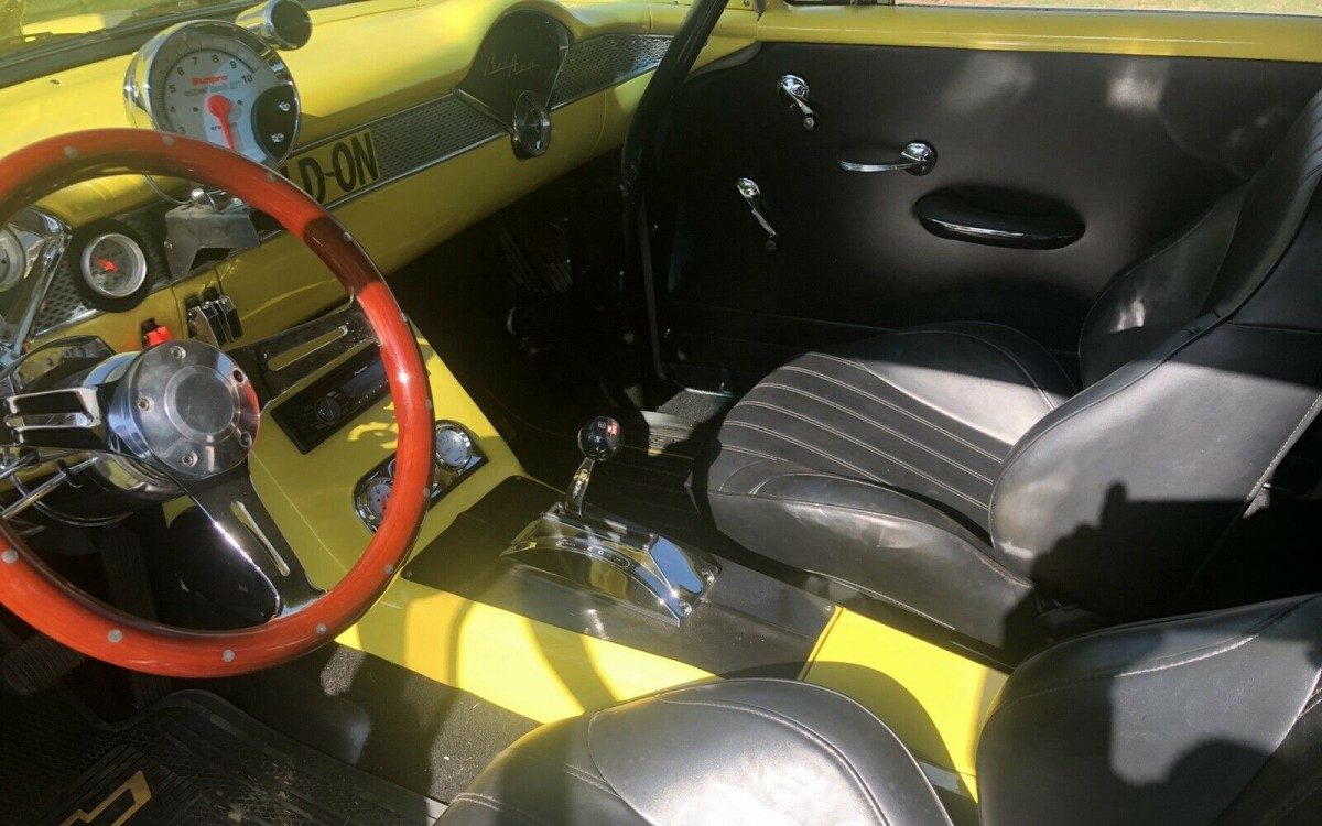 The interior has more of a comfort/cruising vibe than it is a full-on racer environment and that is logical as this Badman isn’t really designed for drag strip action. There is an installed roll bar but it is unknown if it is up to NHRA standards but it’s a nice touch nevertheless. The comfort factor extends to the sculpted bucket seats (a hard-core Gasser would probably have just a driver’s seat) and the custom center console. Also, there are nicely crafted aftermarket gauges occupying the original ’55 Chevy instrument panel binnacle, the kind associated with a street cruiser or a custom.