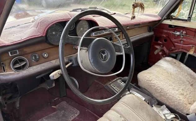Despite this selling point, the seller doesn’t sugarcoat the fact that this is a major project, and we’re glad he was that honest in the listing. The interior does not look to have fared well, wth missing door panels, perished wood trim, and likely a very cracked dashboard under that ancient pad. The floor shift was an option at one point in the production run over a traditional column shift, but I can’t recall if it was standard by this point. The seller reports that it was sitting for years and “….needs everything.” That’s a dangerous admission when it comes to vintage Mercedes, especially when cars that have been loved are still out there.