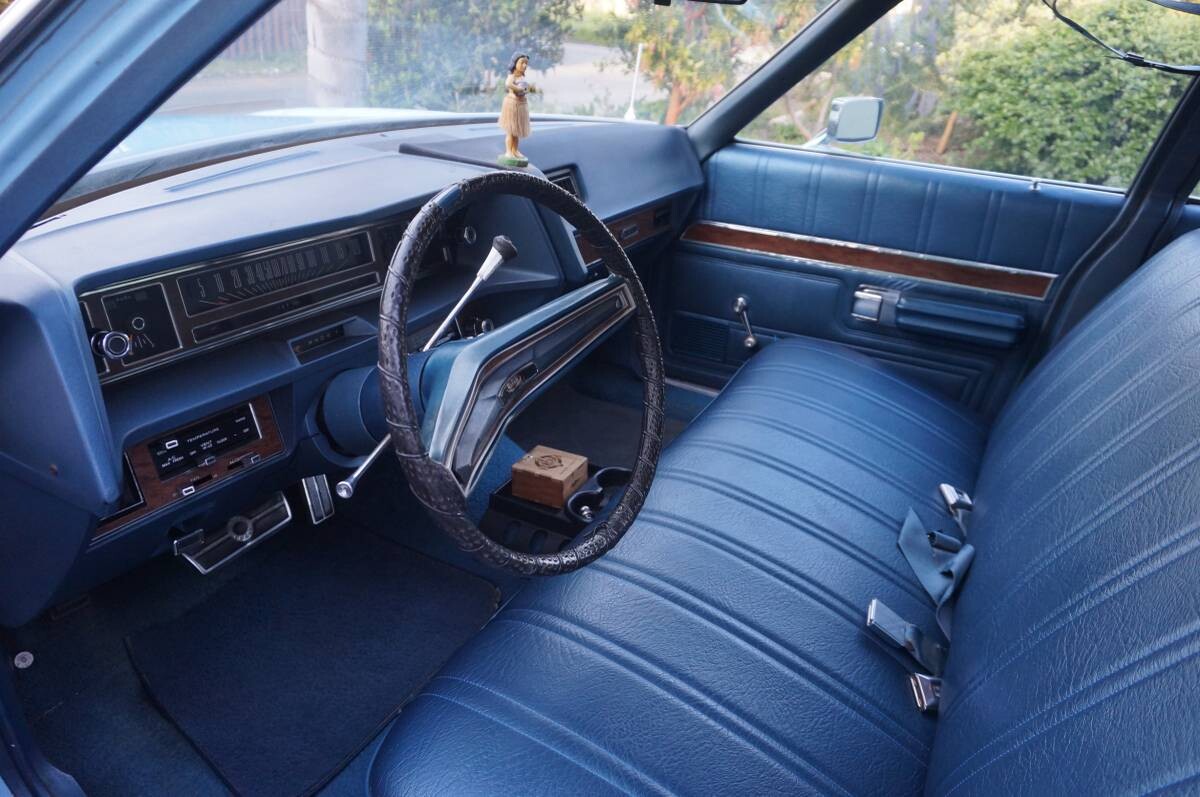 Dad had a ’73 in this same color combo. I had to fight with him to get a car with AM/FM stereo radio (I won). I put a nice little crease in the rear passenger door one evening picking up my sister from church when I took a corner a little too sharp and hit a bollard in the lot. Had the nice turbo-fin hubcaps that went missing after driving it to my high school one day. Big old boat.