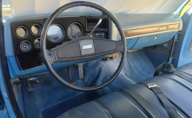 This is one fancy truck, with nice two-tone paint in Skyline Blue and Frost White and white wall tires. GMC referred to this pickup bed as a Wideside, as opposed to their Fenderside bed, commonly called stepside. As with Chevrolet’s naming system of this era, the C trucks were rear-wheel drive, and the K trucks had 4WD. A 1500 is a half-ton truck, and the Sierra Grande was a level above the Sierra.