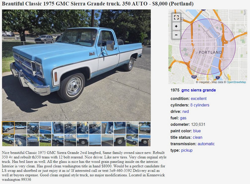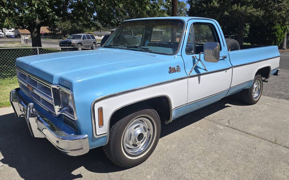 It’s hard to believe that 1975 was 50 years ago. Five decades, gone, poof. Where did all those years go? How many loved ones have gone since then, and how many kids, grandkids, and great-grandkids have been added to the mix? 50 years? I was riding around on my 1974 opaque blue Schwinn Varsity 10-speed, which is the same exact color as this 1975 GMC 1500 Sierra Grande pickup. The seller has it posted here on craigslist in Portland, Oregon, and they’re asking $8,000. Here is the original listing, and thanks to Rocco B. for the tip!