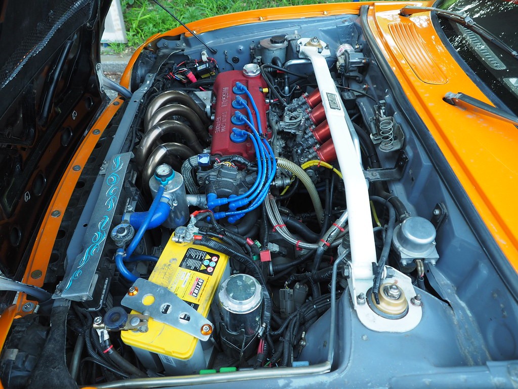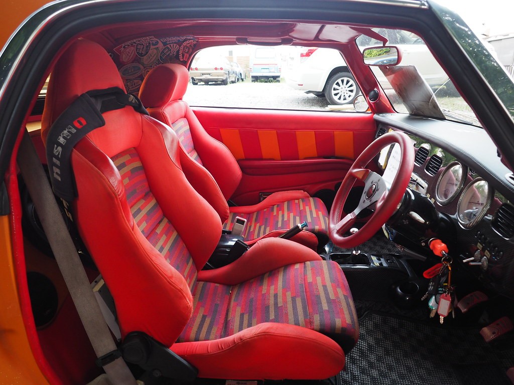 Inside the vehicle, the alterations continue – the seller claims the gauge cluster is the only original item inside the cockpit. There are beautiful Recaro bucket seats and door panels with matching upholstery, plus a Momo steering wheel and pedals. A leather top replaced the old dashboard, and various carbon fiber elements are found throughout the interior, while a red headliner and carpeting also add to the vibrant overall theme of this Nissan. Last but not least, there’s also an impressive aftermarket sound system.