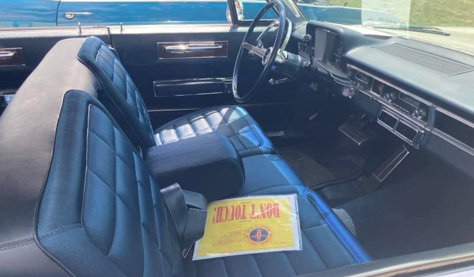The interior is a similar pattern to the ’66 Caprice and the fabric is rich looking. The fender skirts and formal roof line make the car.