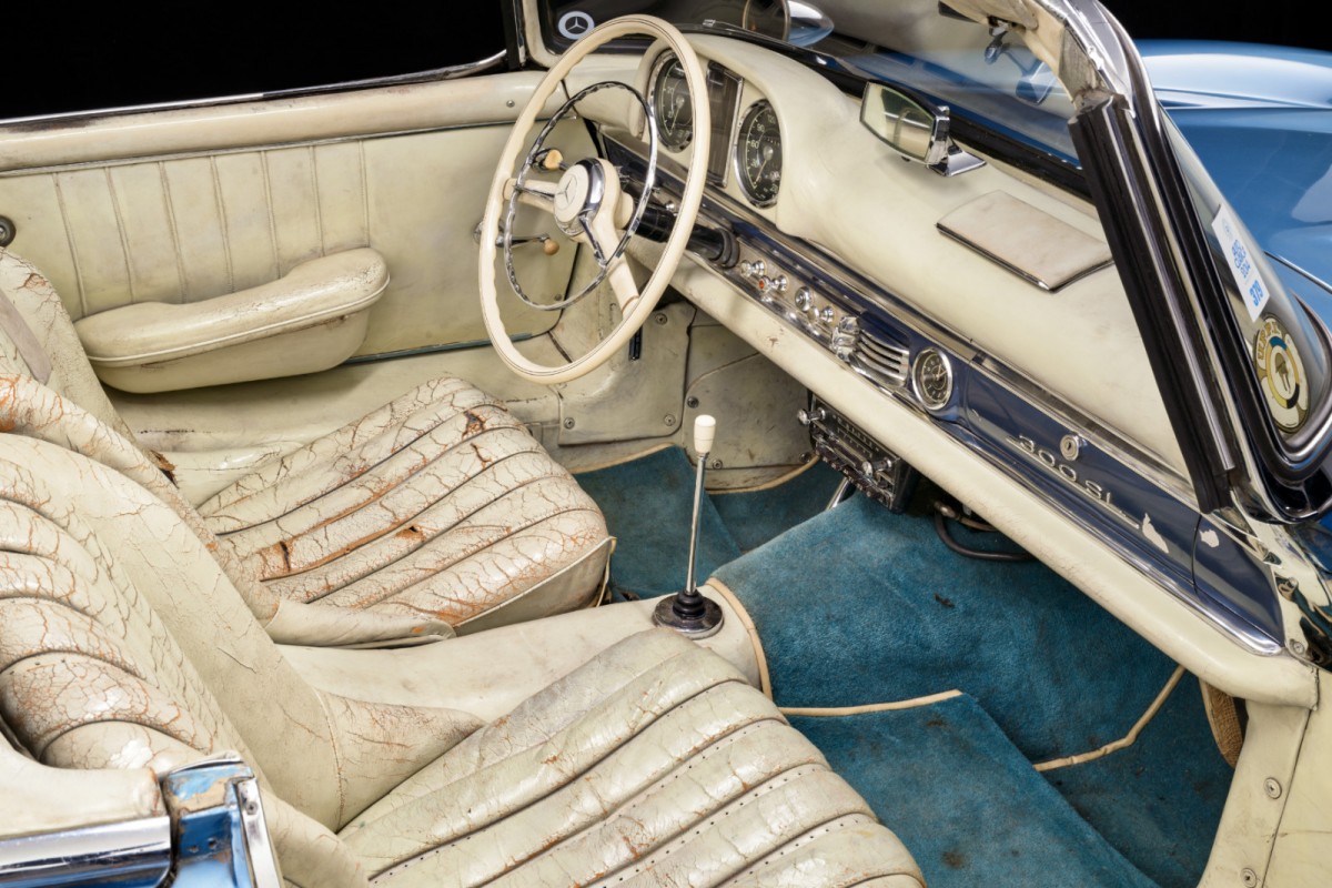 Mercedes-Benz introduced the 300 SL in 1954. Those early offerings were the iconic “Gullwing” version, with 1,400 rolling off the production line before production ended in 1957. However, the company kept the 300 SL badge alive by introducing the Roadster version in the same year. While not as instantly recognizable as its Gullwing sibling, 1,858 buyers parked one in their garage before production ended in 1963. This 300 is an original and unrestored survivor that wears Light Blue Metallic paint. It presents quite well for its age, although the paint has accumulated a few flaws and defects over the years. This is hardly surprising as the great man had the vehicle shipped to all corners of the globe during its active life. It clocked 72,000 kilometers (45,000 miles) before Fangio entrusted it to the museum.