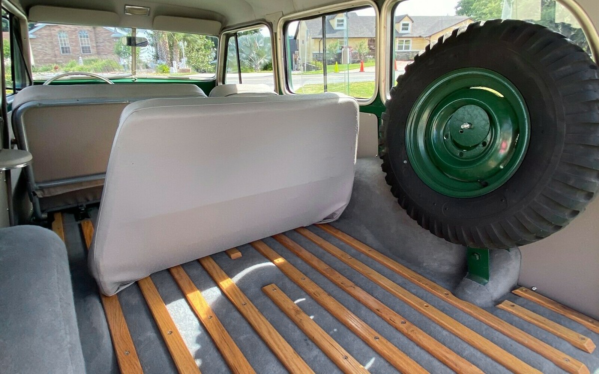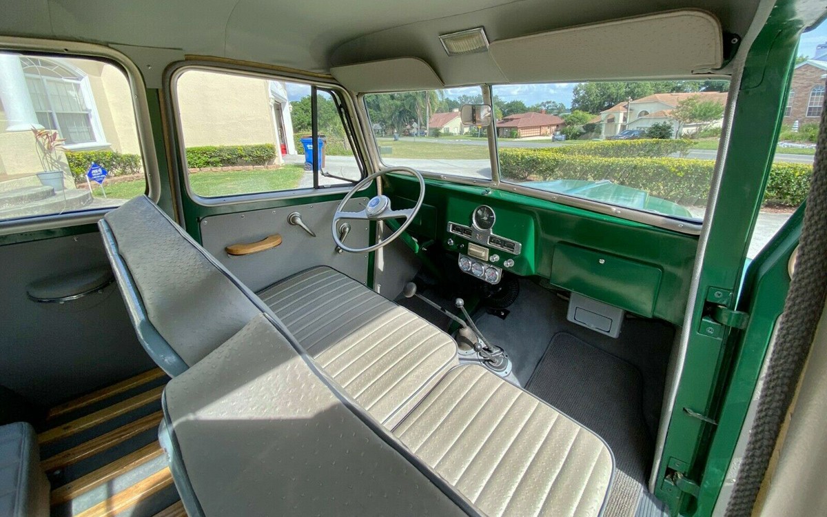 For 1955, Willys was out of the car business and the Willys Jeep Station Wagon was renamed the Willys Utility Wagon – by then the company was owned by Kaiser. That reminds me, I need to get a Willys Aero, too. So many vehicles, so little time (and, money). This wagon has had the floor pans replaced at some point according to the seller and they reportedly look great. So there was rust on or in it at one time. It has new Firestone tires that look great with a perfectly-aggressive tread but not monster truck tires as a lot of these have. They mention a small leak from the rear axle which should be taken care of.