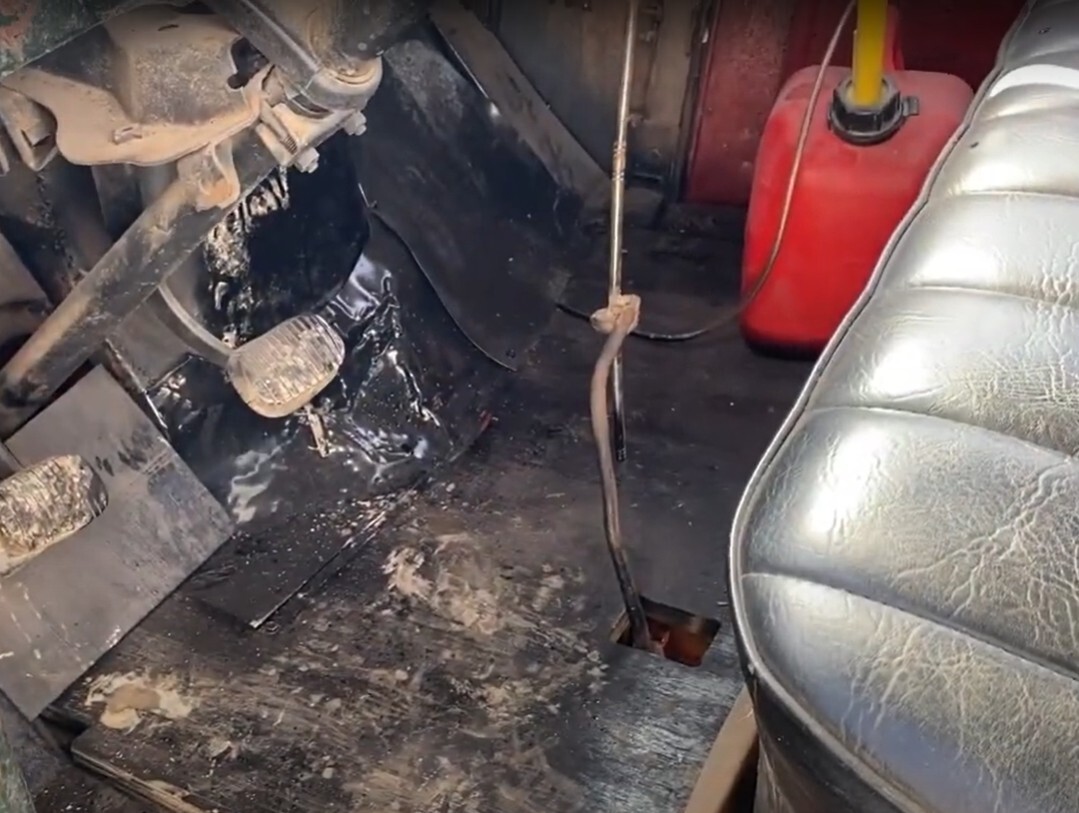 Speaking of shifting, slightly visible here is the truly weird floor-mounted gearshift apparently built from three welded pieces of metal. This photo shows the lower two-thirds of this contraption; this photo shows the shift knob. But hey, that’s what happens when you’ve just been through a Great Depression and then a World War: things are cobbled together from whatever you can find, in whatever way will work. The seller reports that the bench seat and floors are in good shape. One gauge appears to be compromised. There’s no paint remaining on the inside of the roof; both door windows are cracked; and the windshield is so delaminated as to be dangerous. It does crank out, though!