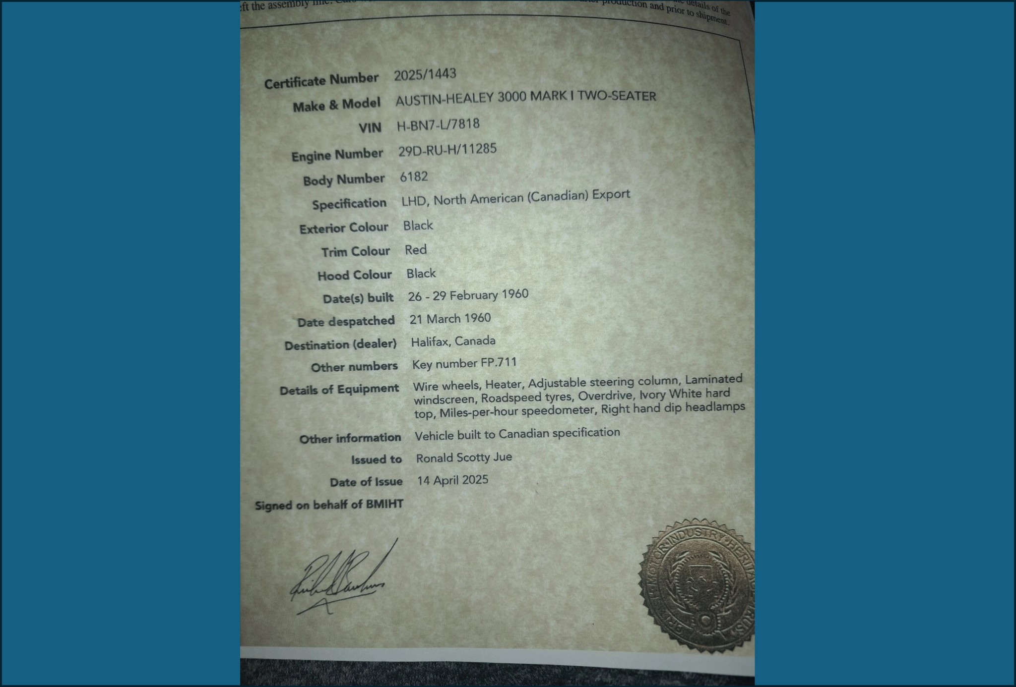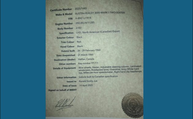One of the great things about the most common British sports cars is that you can find a lot of information from the British Motor Heritage Trust about how the car was specified when it left the factory. A certificate has been obtained for this car and is shown above. Sad to say, the hardtop is no longer with the car, but it was well-equipped and was originally delivered to Canada. You can see it was black with a red interior; a wonderful combination, but I admit I would add red coves if I were restoring the car.