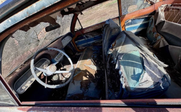 I’m thinking this is a ’60 based on the concave front panel. Someone’s going to really have to have a soft spot for early Corvairs to do anything with this one – it’s a real pig’s breakfast.