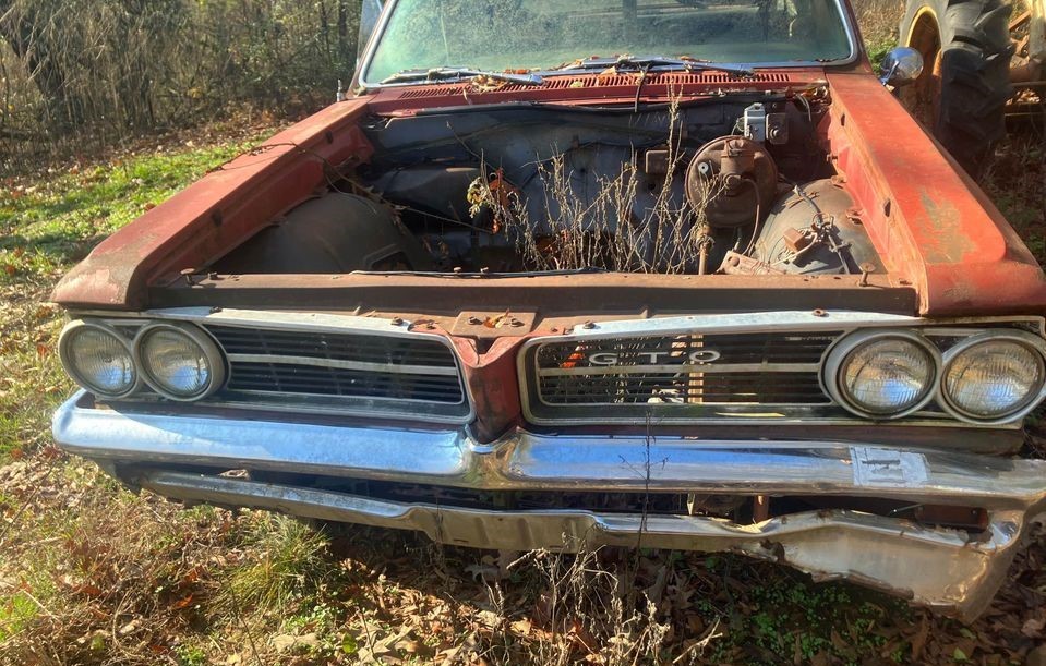 The ’64 GTO is one of my favorite cars, to bad it has sit out in a wet field. I’m looking at a picture of the passenger side, it looks like the rear wheel has shifted forward. This would be a labor of love costing north of 30K to bring back and a lot of time…