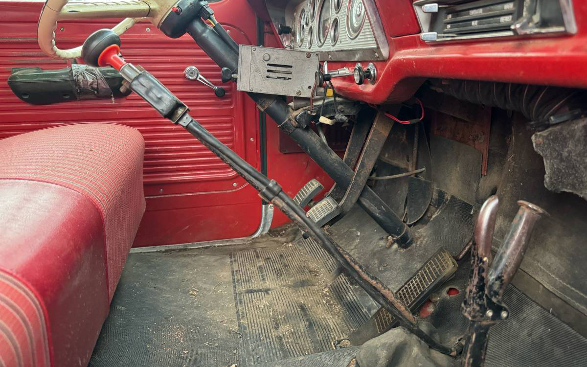 Hey Jay and Howard, if you look to the left of the steering column you’ll see an orange knob, that’s the cable for the hydraulics, all the way out for up, halfway to hold, in for down. On the right of the column is a heavy T handle for the PTO and what looks like a brake controller for trailer brakes. Depending on who installs the body a lot of trucks like this would have 2 cables side by side under the edge of the dash, one for the PTO, the other for the hoist. These Mid-West and Knephide combo bodies are common as dirt around here, barley in the spring, corn in the fall, put the slat sides in the pockets on the side boards and haul cattle the rest of the year.