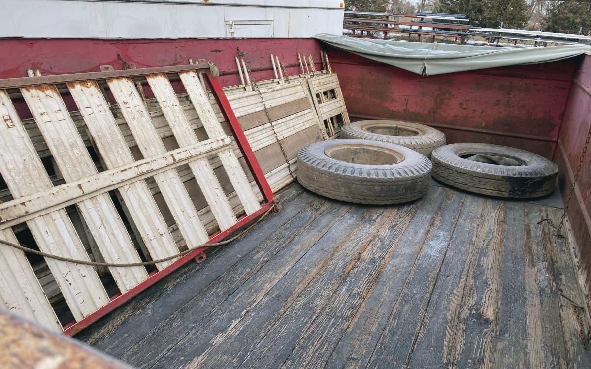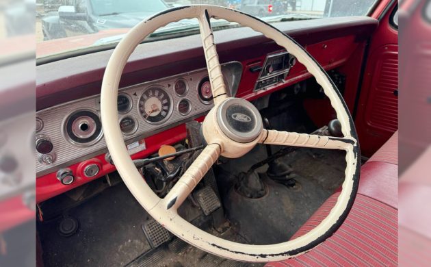 The fifth-generation Ford medium-duty F-Series was made for the 1967 model year, way up until the end of 1979. If you’ve got actual work to do, this is the one you want. In case you’re wondering, here’s what it looks like inside that grainless bed. A couple of the cab clearance lights are broken, but that’s the least of your worries, as this truck needs a radiator and isn’t currently in running condition.