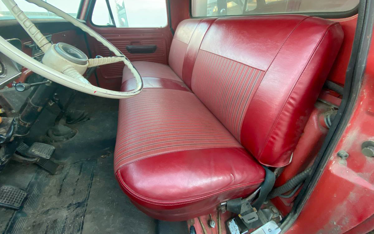 I believe this truck has power steering, and that would sure be a welcome feature for a big truck with what I’m guessing is the longest wheelbase of 194 inches, especially when it’s loaded with grain or other crops or just general stuff. How about that seat! It’s a thing of beauty, much nicer than I imagined the seat would look in this tough farm truck. I believe the little switch under the left side of the bench seat is for an auxiliary gas tank?