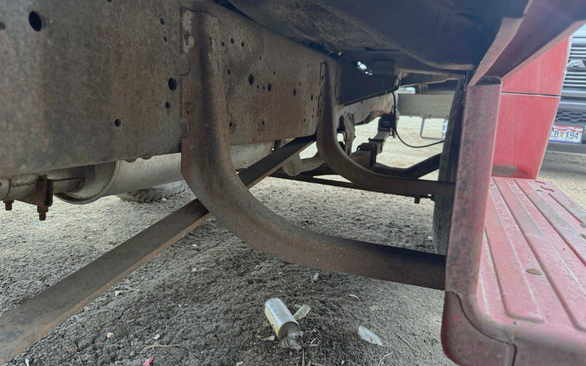 You can’t see it in the photo above, but in this one, I believe that extra switch on the 4-speed manual shift lever is for the 2-speed axle that was standard on the F-600, and also on the F-700, F-750, F-800, and F-8000 trucks. The underside looks good, with just some regular surface rust on the heavy frame components and other parts. A solid front axle was used in place of the Twin-I-Beam suspension on light-duty F-Series trucks.