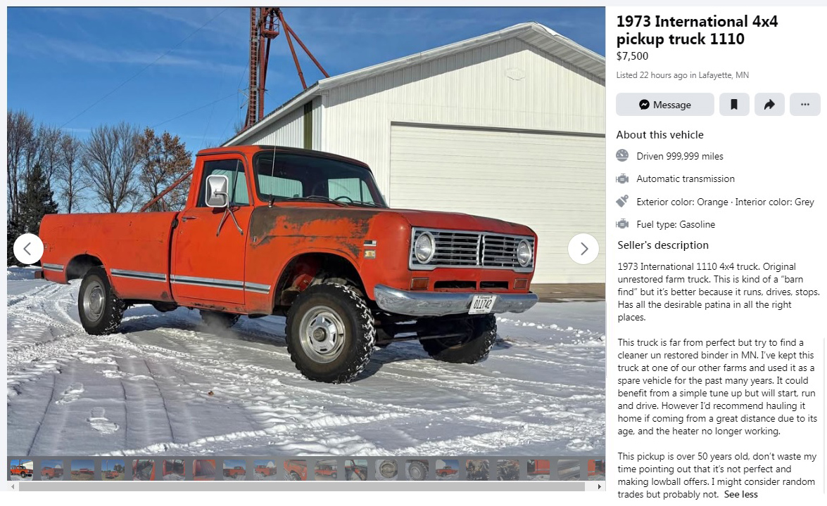 You can see dings and dents, surface rust, and there’s the bent rear bumper, which would have been painted light gray from the factory. Overall, this 3/4-ton 4×4 cornbinder looks perfect to me for what it is and what it’s been used for. I don’t see any rust-rust, as in rust holes, and the seller has included a bunch of photos, so please click on the Facebook listing to see all of them. You know that the box/bed has been used in farming chores, and it still looks good. Hagerty is at $6,500 for a #4 fair-condition truck, as a general reference.
