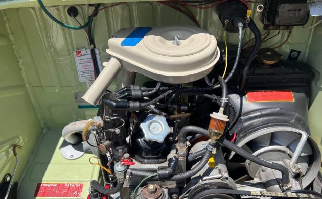 Fiat managed to squeeze everything that matters into a 78.7 inch wheelbase by moving the driver over the front axle, leaving scads (?) of space free for seating, luggage, the motor, and gearbox. Based on the 600, the Multipla inherited its engine along the way, a 633 cc rear-mounted four, good for about 22 hp and a top speed in the 55 mph area. By 1960, displacement had increased, but the horsepower barely budged, and zero to sixty still required about 40 seconds. The four-speed manual is synchro’d on second through fourth. This engine bay is as spiffy as they come without going all-out, and the underside remains pretty fresh too.