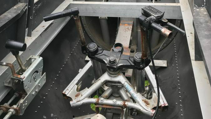 Inside the cockpit, there’s some 1985 Yamaha motorcycle fork parts mated to custom controls. I think I’d want to pad those cut off edges of the motorcycle frame before I tried driving (riding? flying?) this unusual beast.