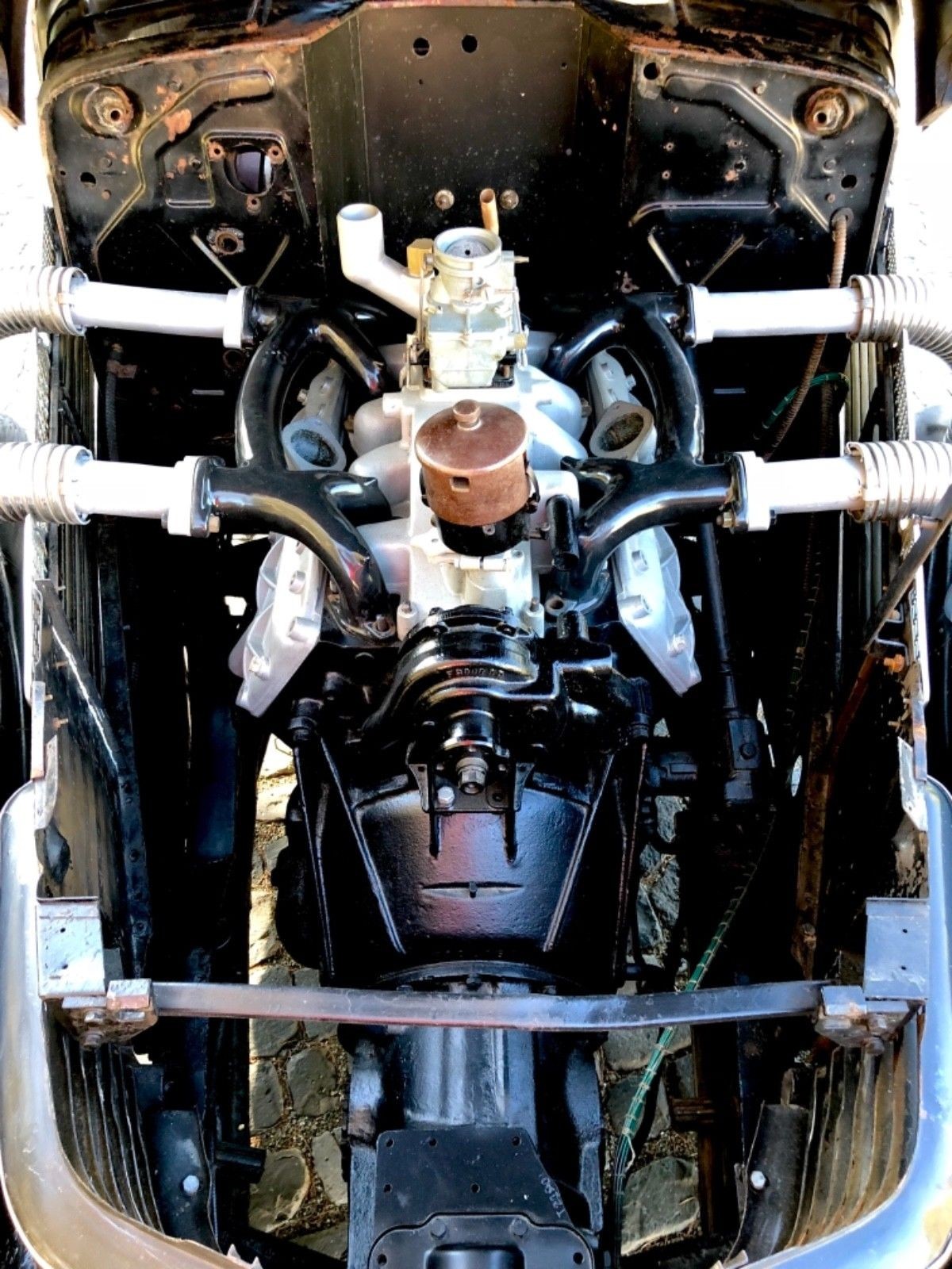 Very strange presentation – looks like the cyl heads have just been bead-blasted, then placed loosely on the block – lots of empty bolt holes – a new version of “kit car”?? lots of miscell. wiring hanging down from dash – owner must’ve given up or passed away part way thru the project –