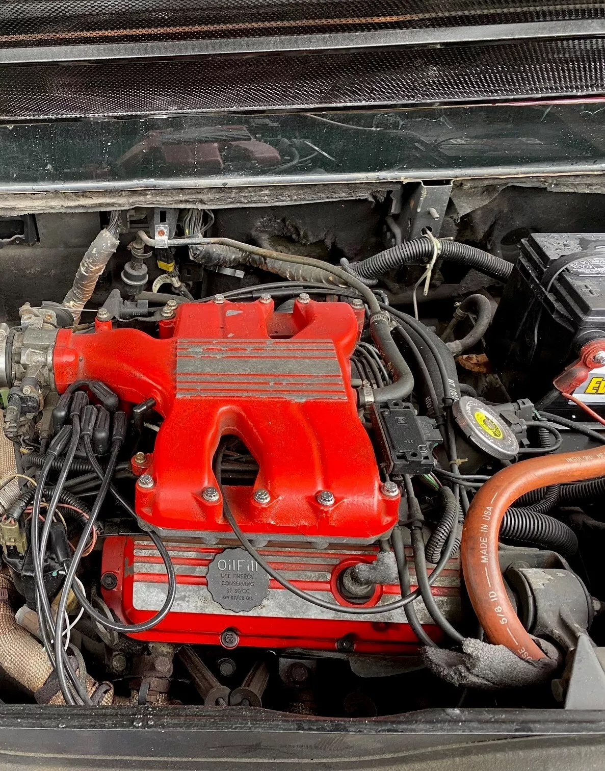 The inline-4 had a stamped sheetmetal valve cover in front of a round carb-style air cleaner, even in the later “Tech 4” fuel-injected spec.