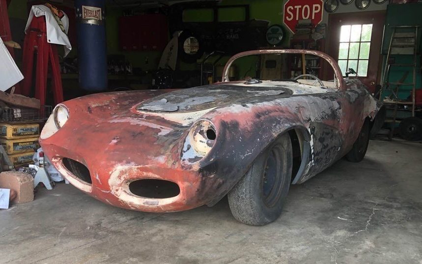 History-wise, the background of this ’56 Conquest is sketchy. Because it has a VW chassis, we assume it also has a VW drivetrain. The seller says that more than 100,000 miles have been put on the car over the past 65 years. The VW pan is rusted out and the body has seen better days, as well. It rolls and steers and has just one mag wheel along with three steel ones. The photo in the garage is likely the most recent one, as another has a stamp date in 2009.