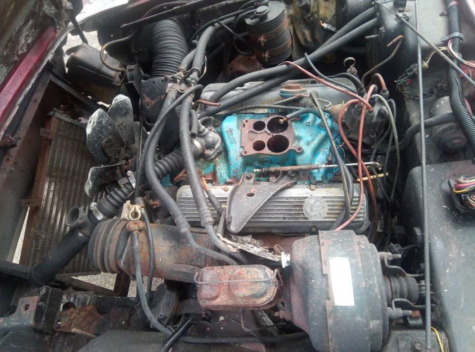 Parts of the Chevy V8 are missing (at least the carburetor) and are perhaps included in the “lots of extra parts” the seller says are coming with the car. So, a lot of assembly or repair work under the hood will be required. The mileage claimed is under 60,000, so it must have had some premature issues to give out so early. This car has an automatic transmission, which would likely be GM’s Turbo-Hydramatic.