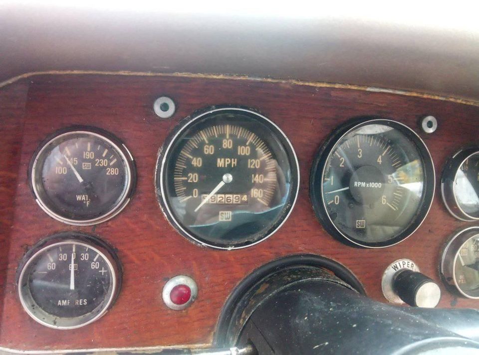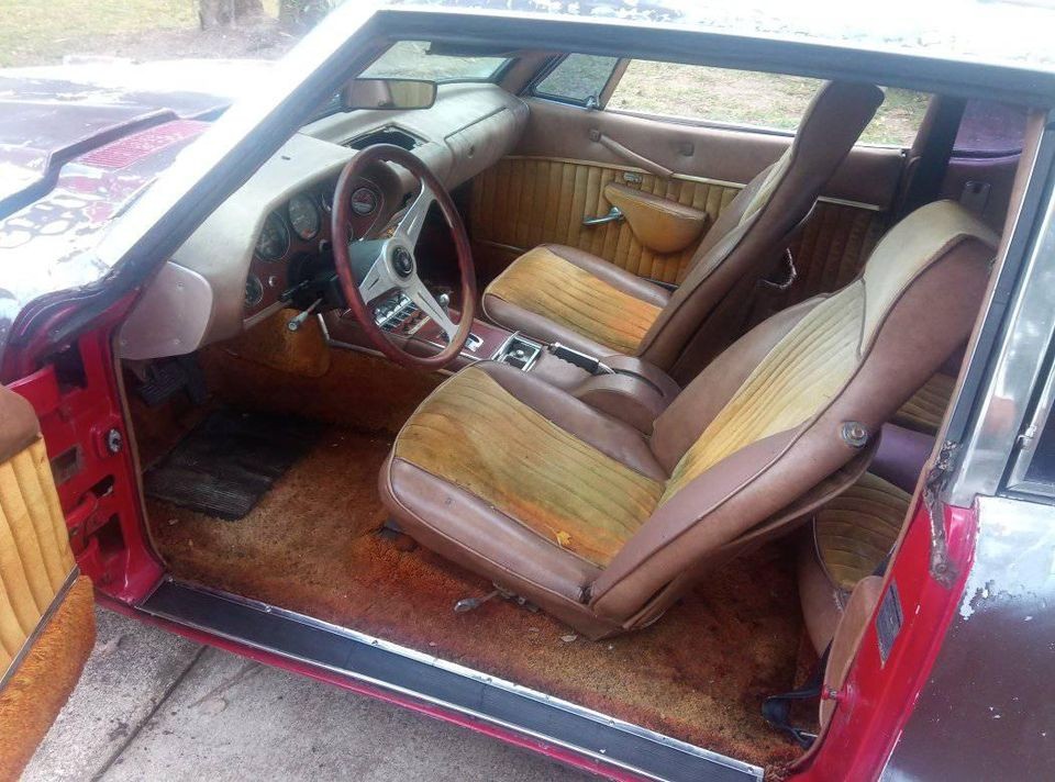 This 1978 Avanti II has been in storage for years. The fiberglass body is in fair condition, but there looks to be a big chunk out of the right front fender and the front bumper is missing, at least for it being on the car. It was painted red at one time, then burgundy later. Back in those days, you could get these cars painted in just about any color you wanted. This one has a sunroof with no mention of whether it’s waterproof. This option was not available on the original Avanti.