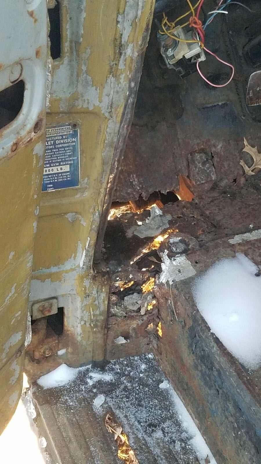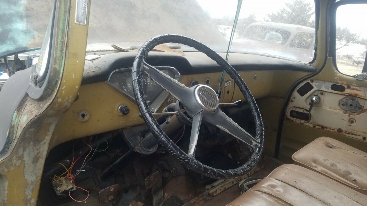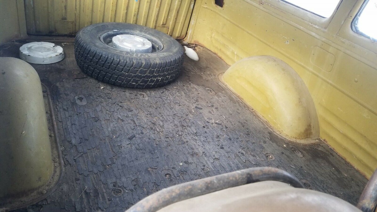 While a small-block V8 could be ordered with the Suburban for 1956, the base engine was the 235 cubic inch inline-six, which is how the seller’s van is equipped, including 3-on-the-tree. We’re not sure how active the seller’s truck has been, but we’re thinking it has been laid up for a while. The snow you see on the ground around the Suburban is also inside the Suburban, which may have happened because the doors don’t latch. The seller says the vehicle has rust “in the usual places.” As we see some big holes in the floorboards, those usual places must be associated with the undercarriage.
