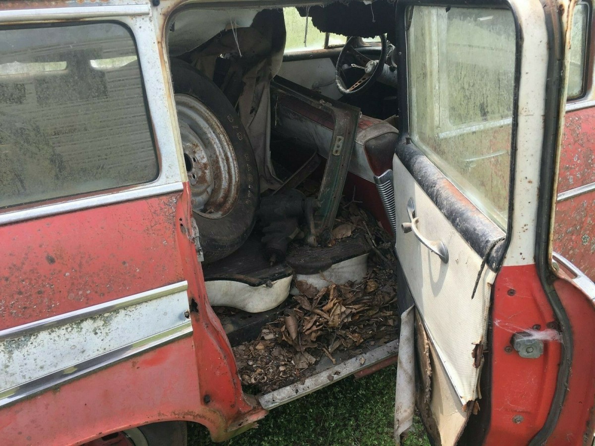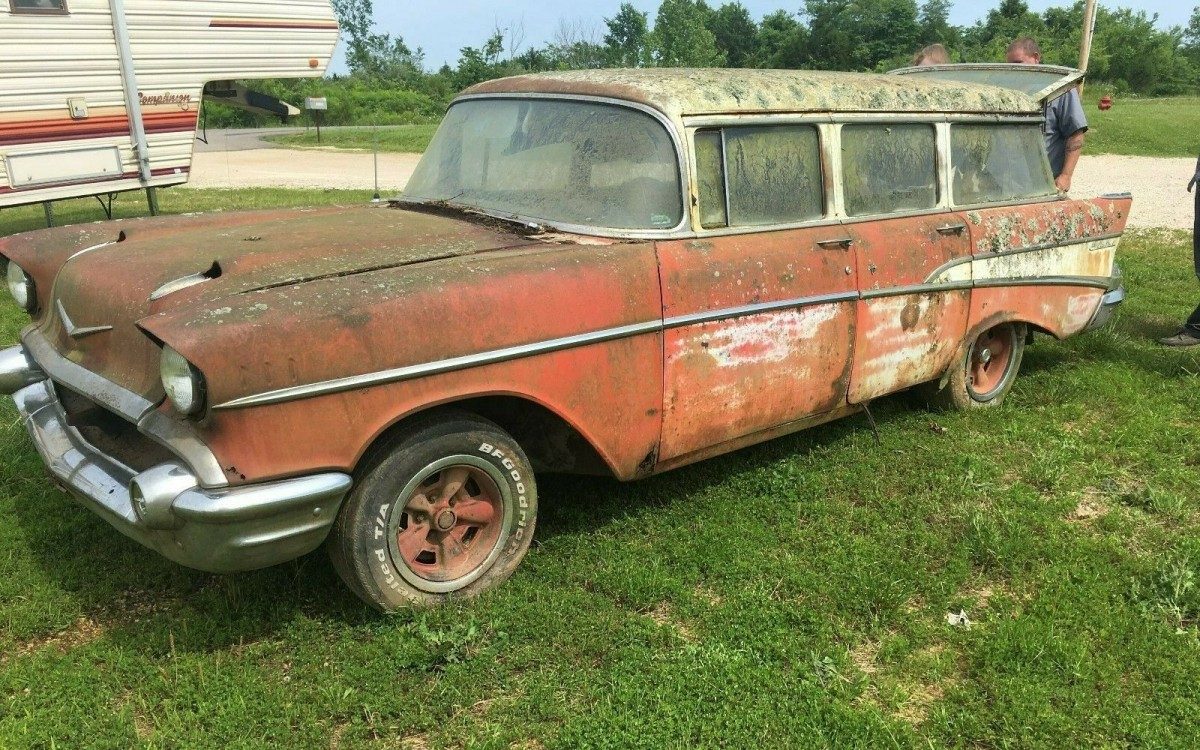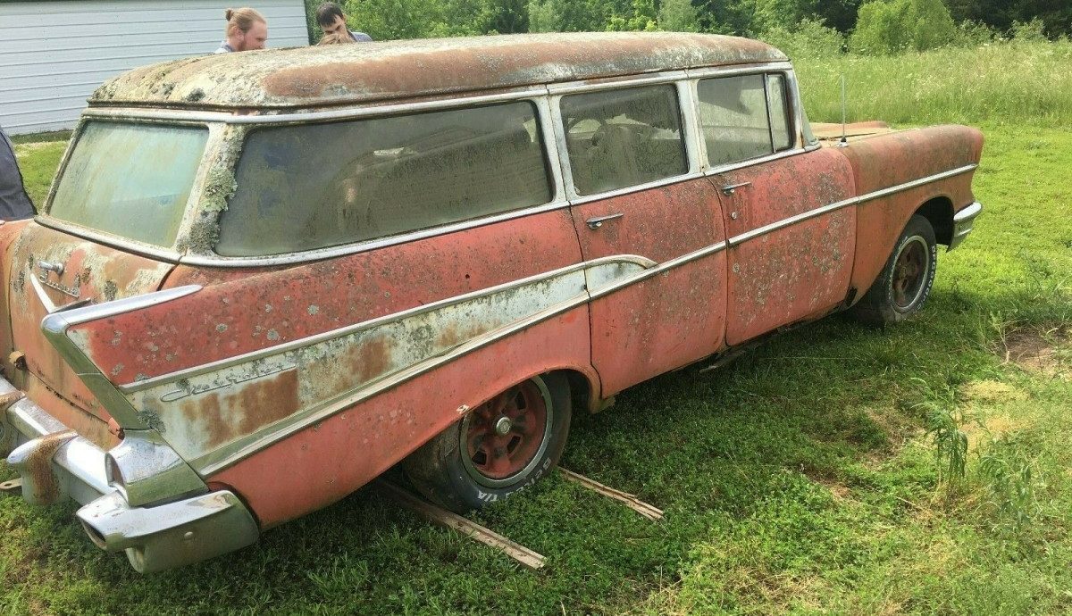 Rescued from a field, this 57 Chevrolet station wagon has seen better days but still holds some merit. With plenty or rust, some tree mold, and probably a few mice, this wagon project is described as being relatively complete minus the engine and transmission. With time ticking down in the auction, this ’57 Chevy is currently bid up to $2,000. Check it out here on eBay out of Bonne Terre, Missouri.