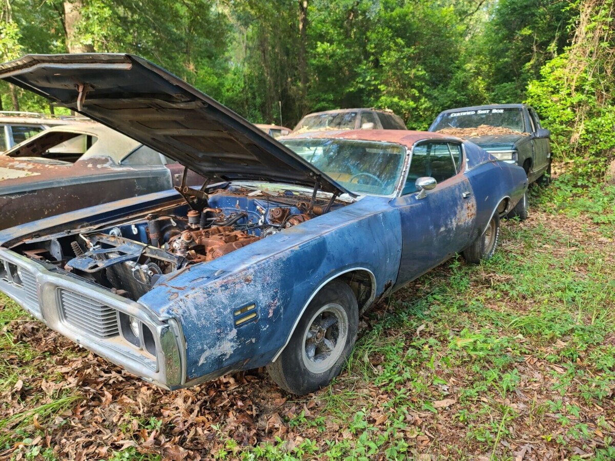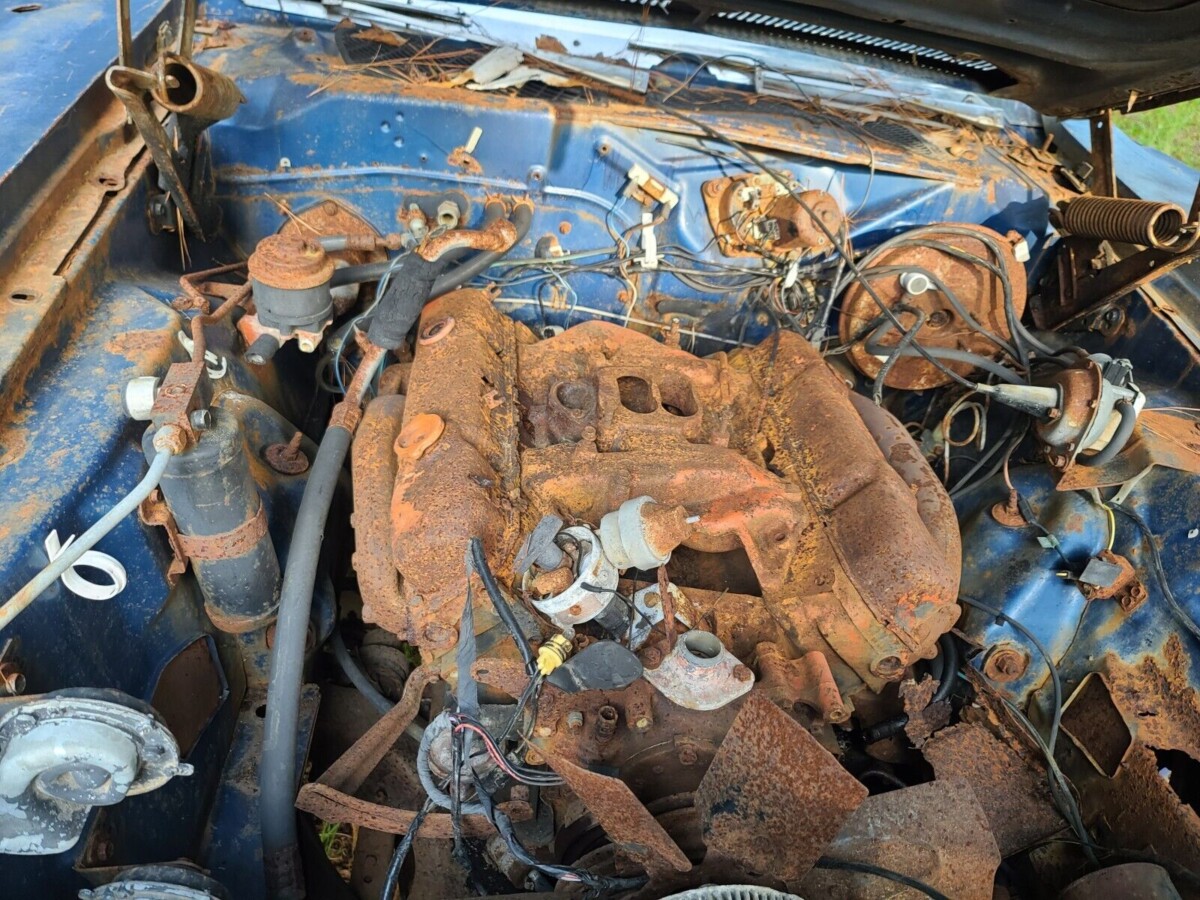 The seller took this Charger in on a trade, so the background on the car is limited. It has the 383 cubic-inch “Hi-Perf” V8 which was in its last year in 1971, to be replaced by a 400 a year later thanks to the detuning that had begun to lower exhaust emissions. We don’t know if the motor, partially disassembled as quite rusty, is original to the car and the same might be said about the column-shifted 727 automatic transmission. We’re told this Dodge at one time had factory air conditioning.